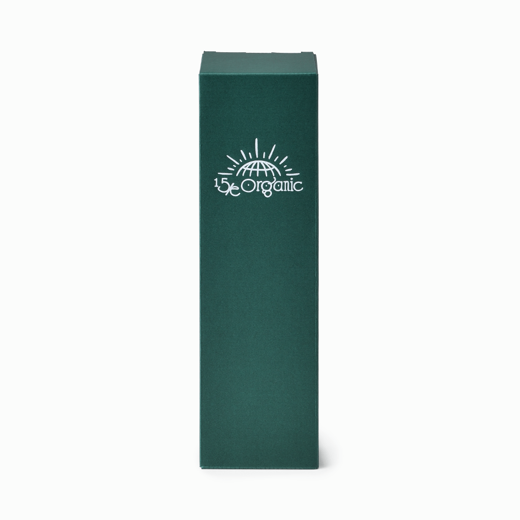 落ち着きのある深みのグリーンに、15/e organicのロゴを配置した、シンプルで高級感のあるデザイン。