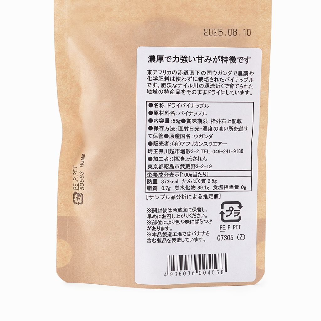 赤道直下の国、ウガンダで採れたパイナップルをそのまま乾燥させました。