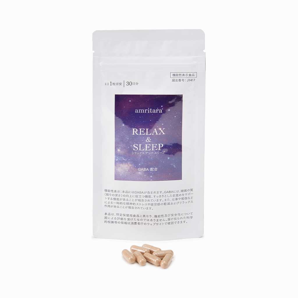 リラックス アンド スリープに含まれる「GABA(ギャバ、γ-アミノ酪酸)」には、睡眠の質(眠りの深さ)の向上に役立つ機能、すっきりとした目覚めをサポートする機能、また、仕事や勉強などによる一時的な精神的ストレスや疲労感の軽減およびリラックス作用があることが報告されています。