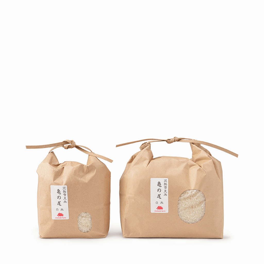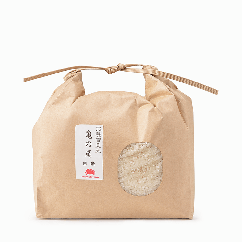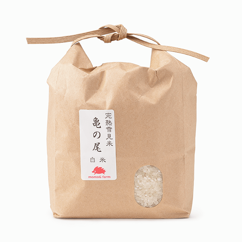 通常は秋に収穫するお米ですが、それ以降も栄養価を吸収できるため、あえて冬の寒い時期まで完熟させることで糖分がグッと味に乗った完熟雪見米の亀の尾です。