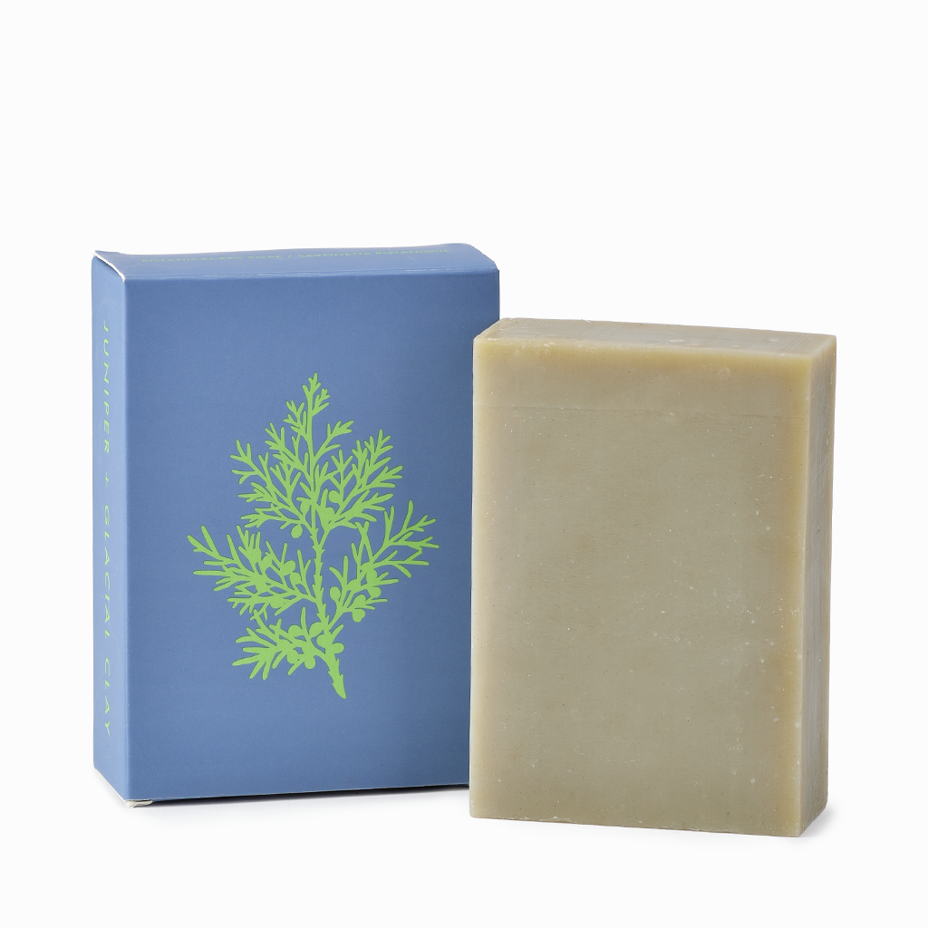 ワイルドクラフトのジュニパーの果実と枝葉から抽出したエキスと、カナダのブリティッシュコロンビア州の氷河から採取したグレイシャルクレイをあわせた、ミネラル豊富な石けん。