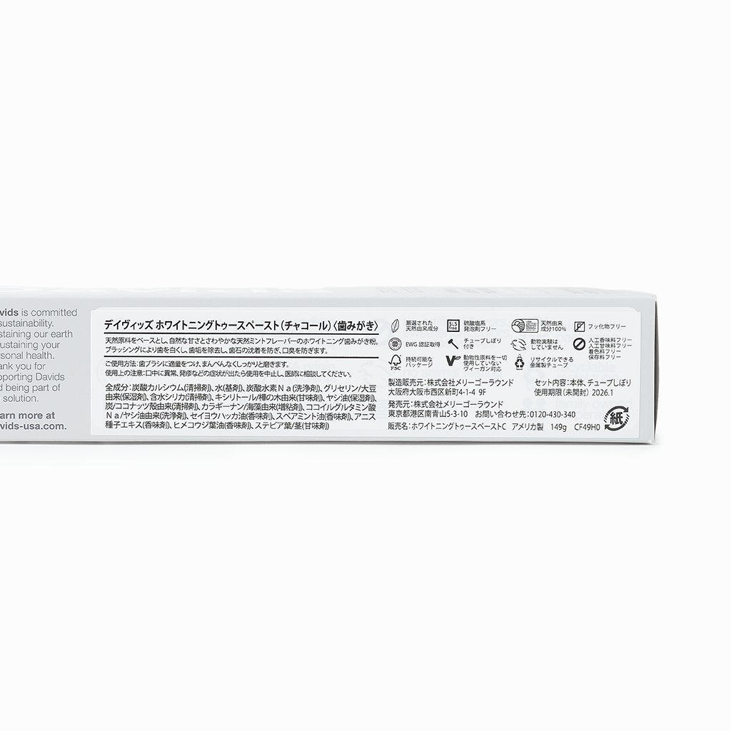 ココナッツの殻を高温処理することでつくられる、何百万もの微細な穴のあいた活性炭。磁石のような吸着力をもち、口臭の原因となるニオイを取り除きます。さらに、ブラッシングにより歯の表面の汚れを取り除き、歯を白くする効果も。Davidsが使用するココナッツ殻活性炭は、粒子が非常に細かく、歯のエナメル質を傷つける心配はありません。