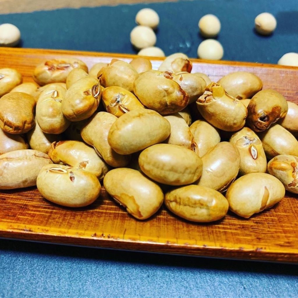 丸玄自家栽培大粒大豆(無肥料.自然栽培……自家採種歴40年以上)遺伝子レベルで記憶し、たくましく育った大豆を煎り豆にしました。